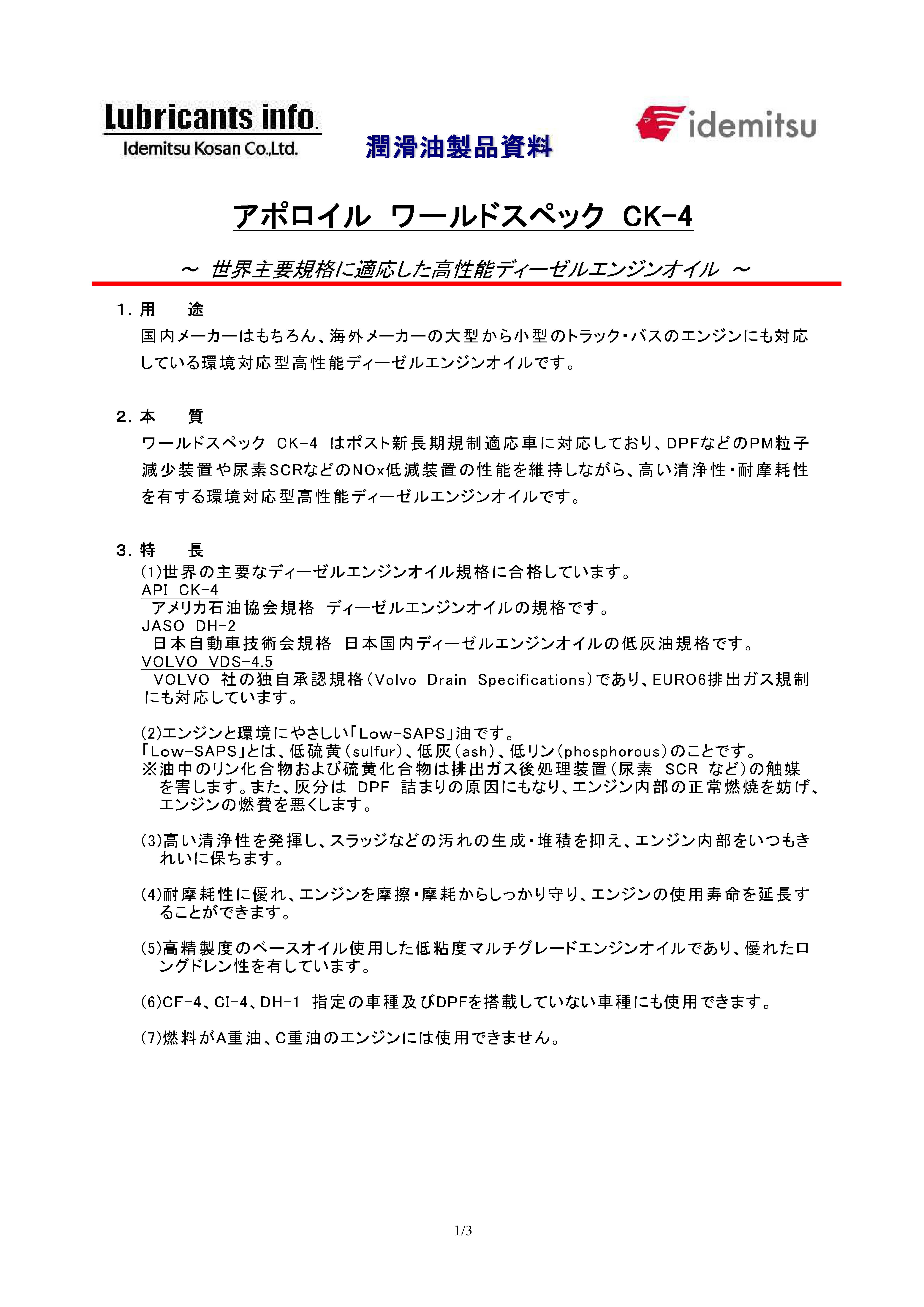 DH-2、CK-4、VDS-4.5(ボルボ)規格に適合したDPF対応の高性能ディーゼルエンジンオイルです。