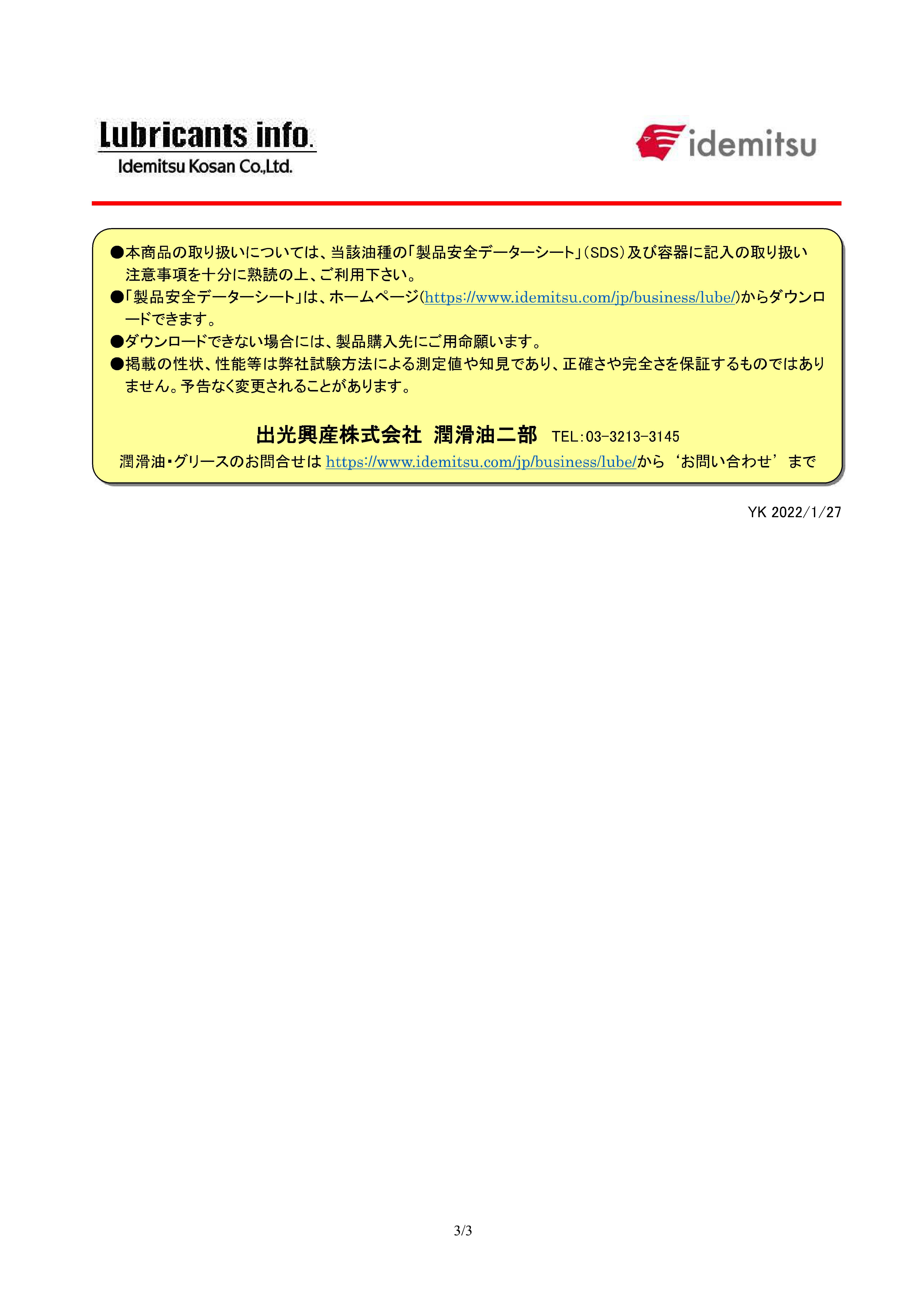 | 返品・不良品・注意 | ■お客様都合の返品、ご注文後のキャンセルはお受けできませんのでご了承ください ■不良品、誤配送、缶のへこみや損傷、漏れ等があった場合は弊社負担で交換させていただいますのでご連絡ください ■実際の油種選定は機械(車両)メーカーの取扱説明書に従ってください、当HPをもとに油種選定を行いトラブルが発生しても弊社は一切の責任を負いません |