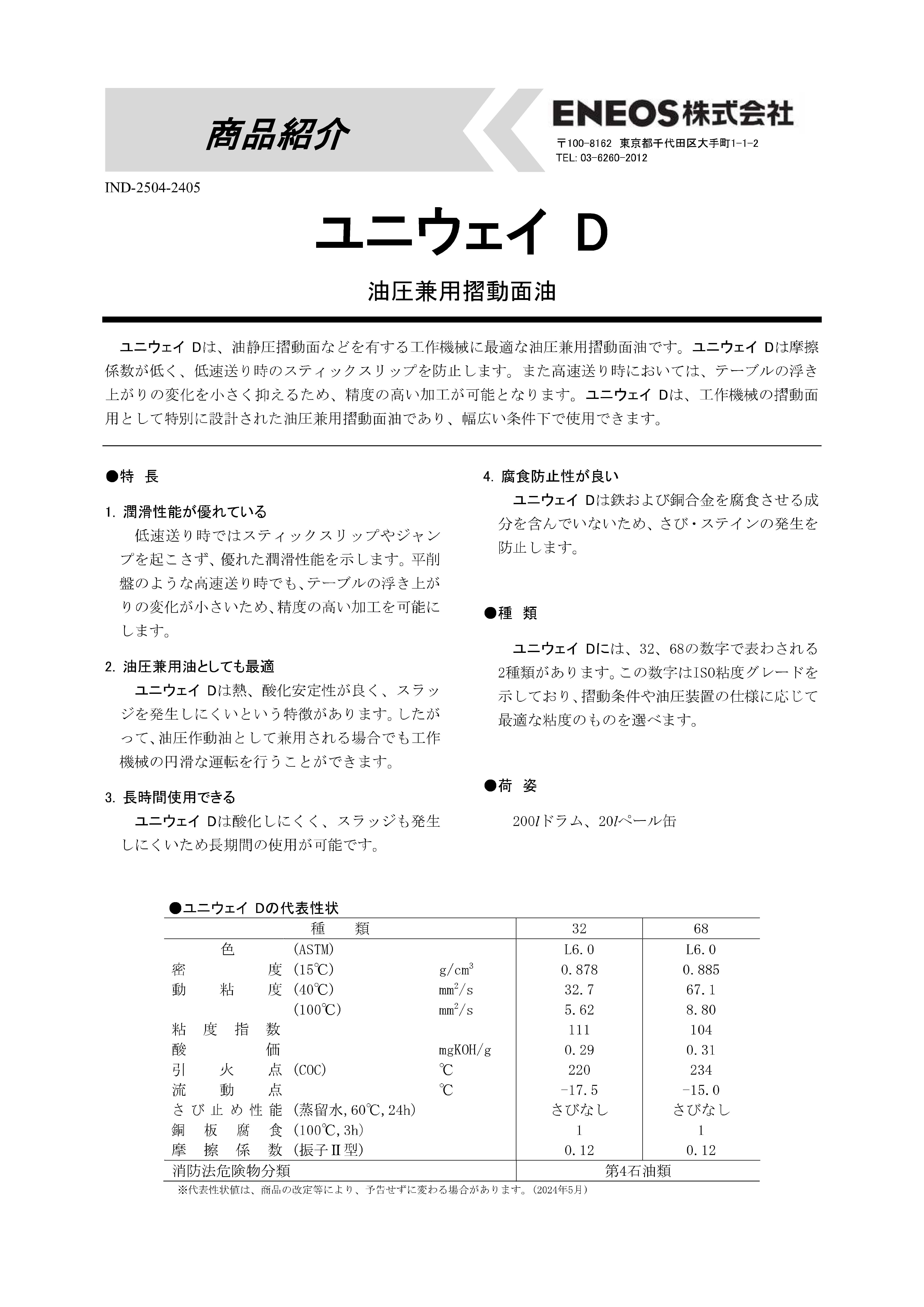 ユニウェイ Dは熱、酸化安定性が良く、スラッ ジを発生しにくいという特徴があります。したが って、油圧作動油として兼用される場合でも工作 機械の円滑な運転を行うことができます。