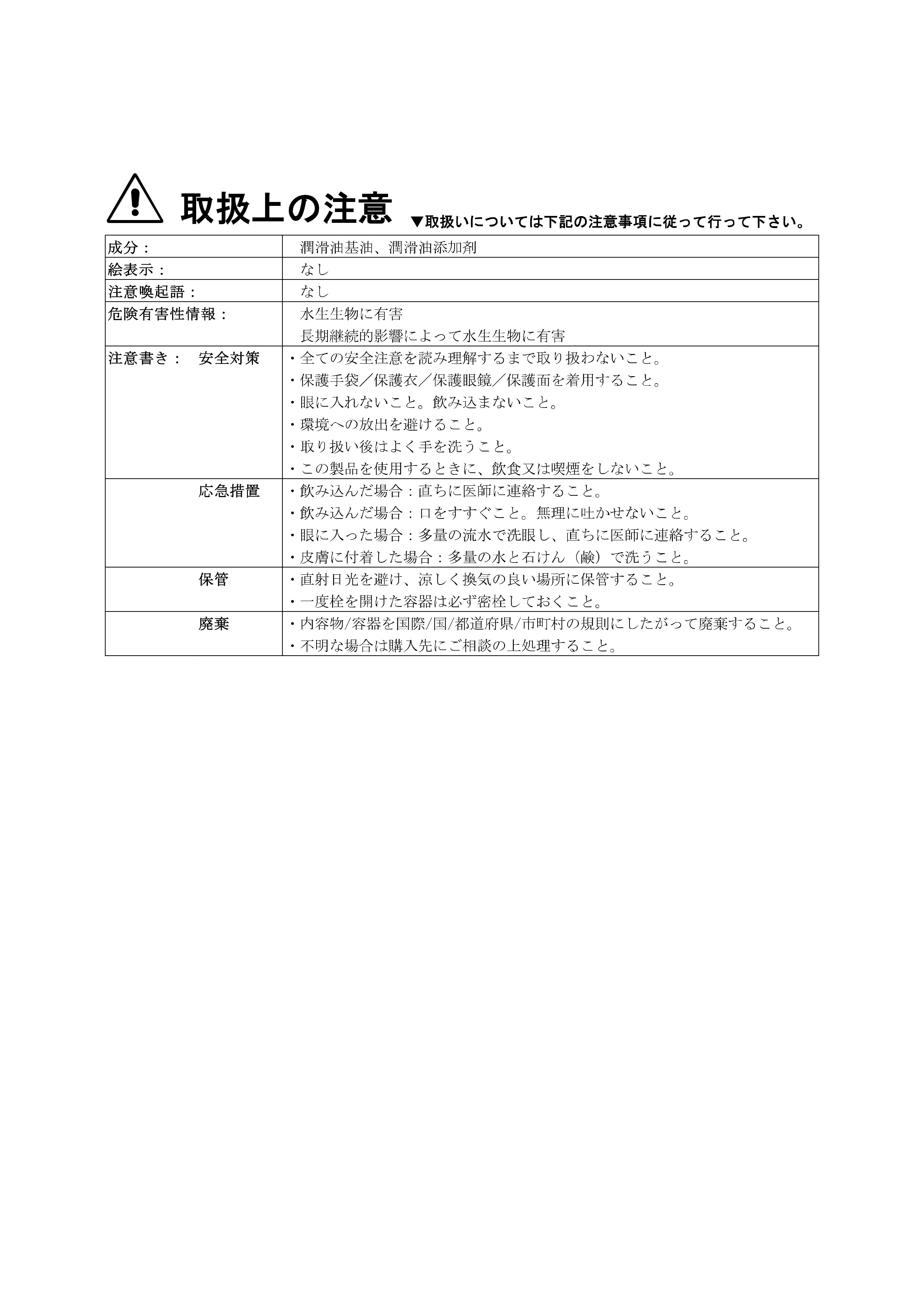 | 返品・不良品・注意 | ■お客様都合の返品、ご注文後のキャンセルはお受けできませんのでご了承ください ■不良品、誤配送、缶のへこみや損傷、漏れ等があった場合は弊社負担で交換させていただいますのでご連絡ください ■実際の油種選定は機械(車両)メーカーの取扱説明書に従ってください、当HPをもとに油種選定を行いトラブルが発生しても弊社は一切の責任を負いません |